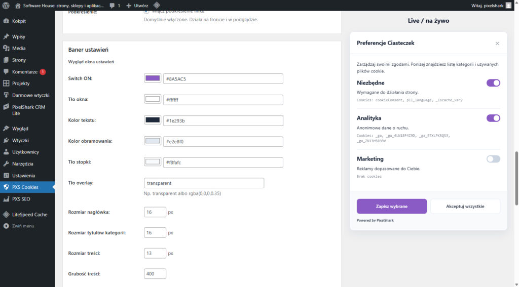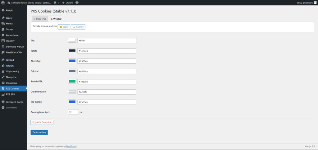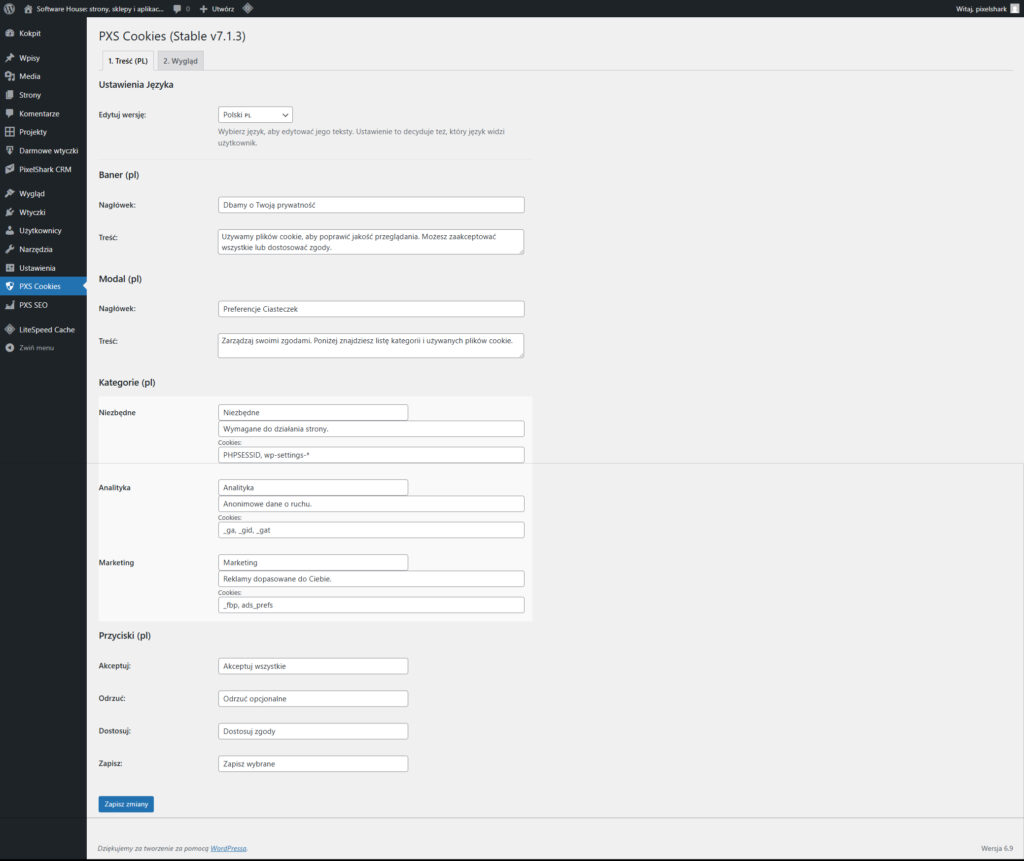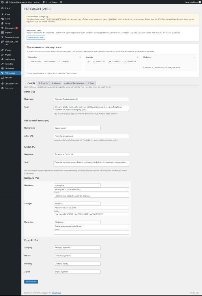 Większość rozwiązań obsługujących Consent Mode v2 jest płatna lub wymaga skomplikowanej rejestracji w zewnętrznych serwisach. PXS Cookies Pro daje Ci pełną kontrolę bezpośrednio w Twoim WordPressie – całkowicie za darmo.